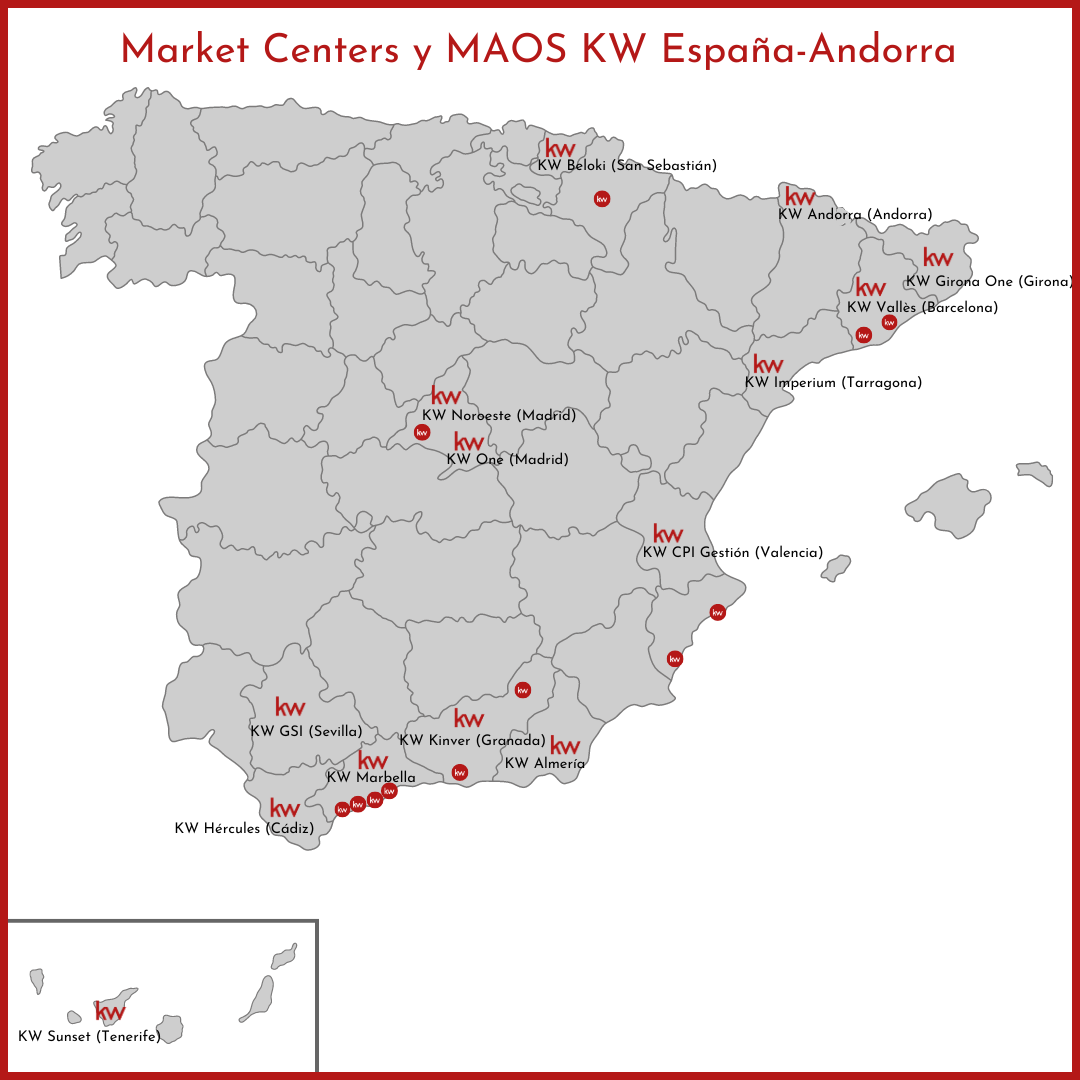 Situación de los Market Centres Keller Williams en España-Andorra. Para contactar con los Market Centers y Mega Agent Offices (MAOs) PULSA AQUÍ.